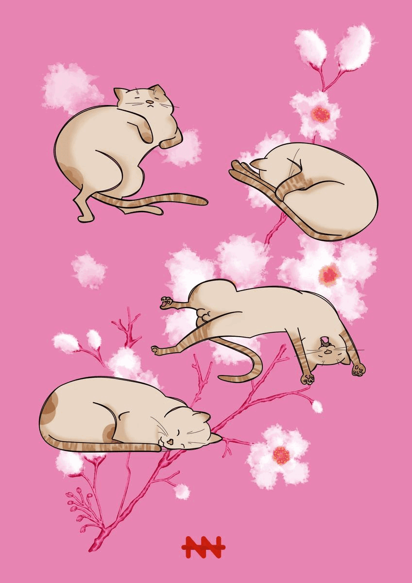 «Gatos y cerezo» nació observando todas las posturas en las que mi mascota tomaba una de sus humildes siestas de 10 horas. En mi familia hemos visto crecer a este gato, desde ser una bolita de pelo que no ocupaba más que la palma de nuestra mano hasta ser el gato adulto y dormilón que tenemos hoy.