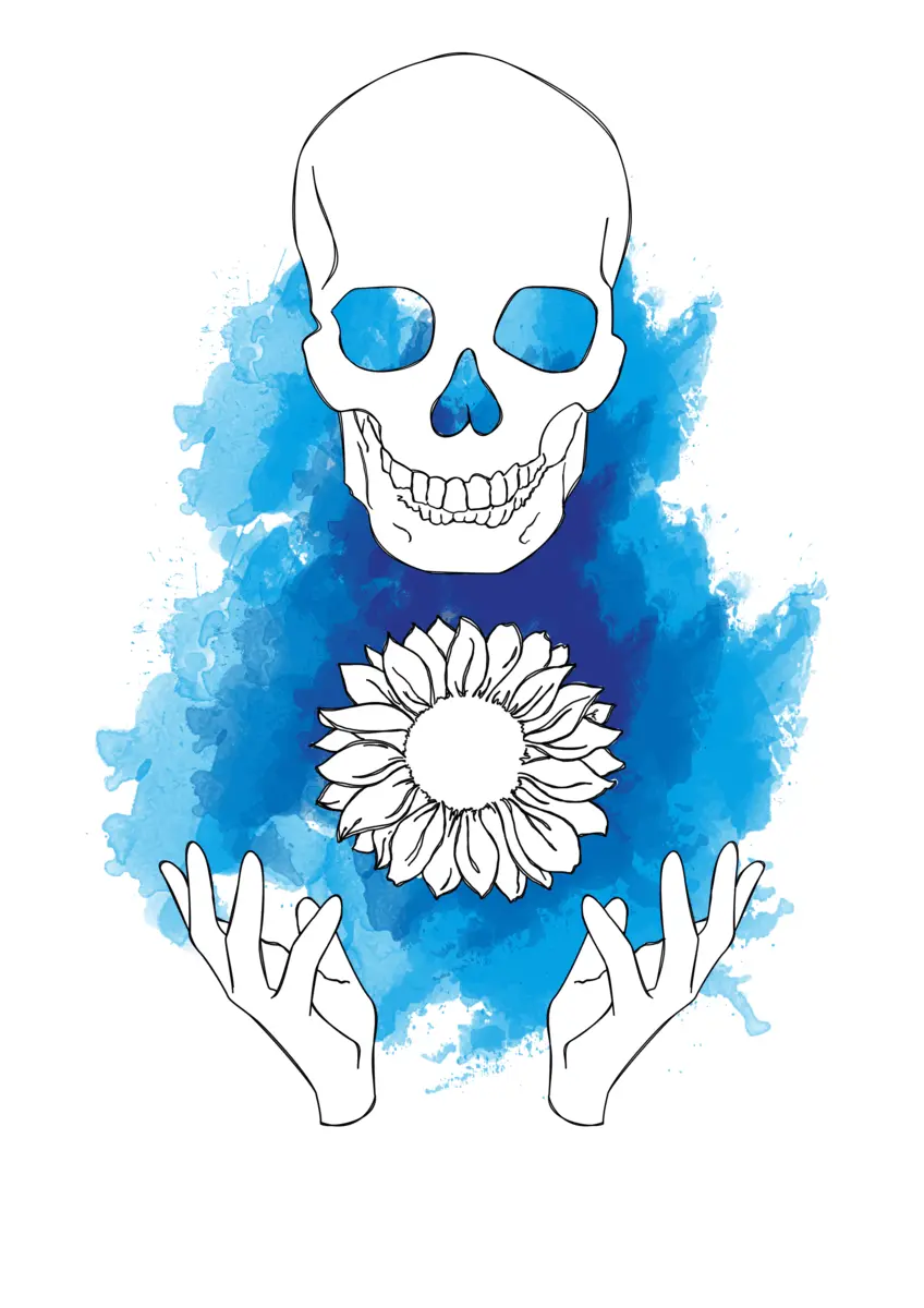 • Azul para la fluidez, los cambios. El azul con el efecto acuarela mostraría la facilidad con la que todo puede cambiar, como si de un río se tratase. Y en ese río es donde puedes encontrar tanto la vida como la muerte.